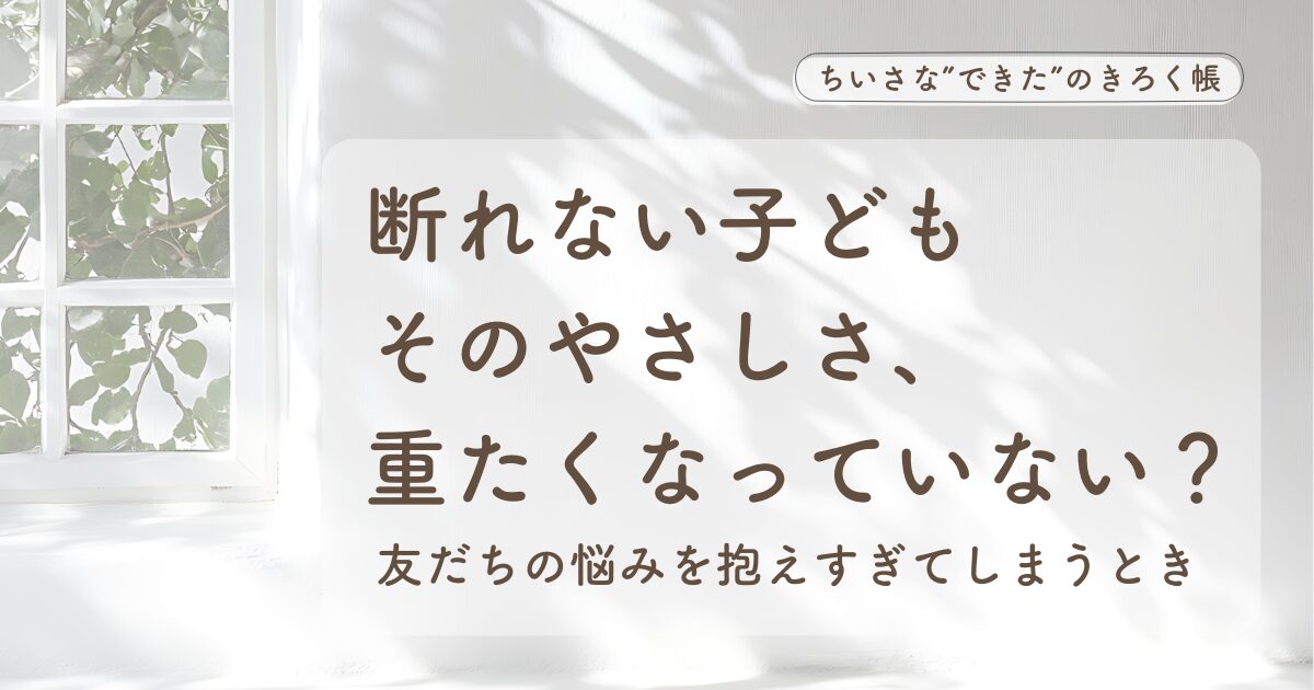 断れない・やさしすぎる子どもが抱えやすいしんどさと、親ができる声かけや関わり方をまとめました。友だち関係で疲れているサイン、気持ちを守る考え方、「同意」「バウンダリー」の視点もやさしく解説しています。